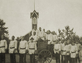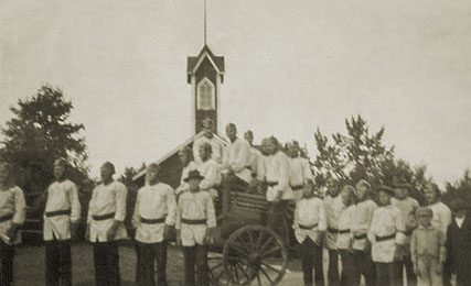 Palokuntalaisia kalustovajan edessä VPK:n alkuajoilta